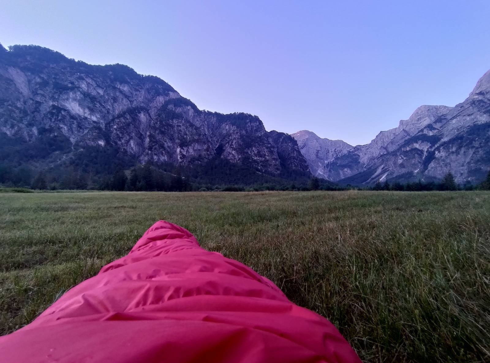 In addition: no need for a bivouac bag, as the materials finish is water repellent. One fateful night on my first long hike 160km through the Austrian alps, I slept under a tree. While it was raining. Without a tent. Yes yes. Terrible idea. But: In the morning there was not a single square centimetre of my bags material that was soaked. I could just shake all the droplets off and pack it up dry and ready for the next night. There were a bunch of gooey trails though, as snails crawled over me all night long. As far as I know there is no brand that advertises their snail-repellent finish though… So, no hard feelings.