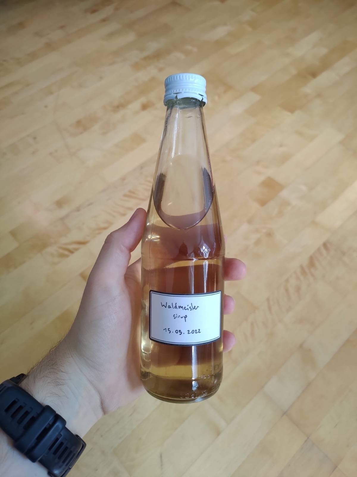 Because I was out of woodruff, I had to forage again. Going to Cobenzl wasn’t very attractive though, as the ride with public transportation would have taken almost an hour. Instead, I scanned the biggest wooded area in Vienna I live close by, the Prater. After an hour of looking out, I found a very small patch, which I meticulously harvested to get the most out of it. In the end, it was enough for half of the recipe’s ingredients. The plants got cleaned and dried, and a 3:2 sugar syrup prepared. The dried plants had to be submerged again, though this time in 96% vol. alcohol which I bought at the apothecary. 24h later, the alcohol turned into a deep, deep green, so green it was almost black. I was in awe. I did not expect the alcohol to be so good at extracting the colour, especially after the syrup was a disappointment, at least colour wise. I strained the alcohol and held back the plants, added the plants to the syrup, reheated and mixed alcohol with the syrup before bottling. And just wow. What a liquor. With around 48% vol. very intense for liquors (they usually come around 20% vol.), flavour wise sharp, astringent but the coumarin (the agent that gives woodruff its flavour and smell) was not overpowered.